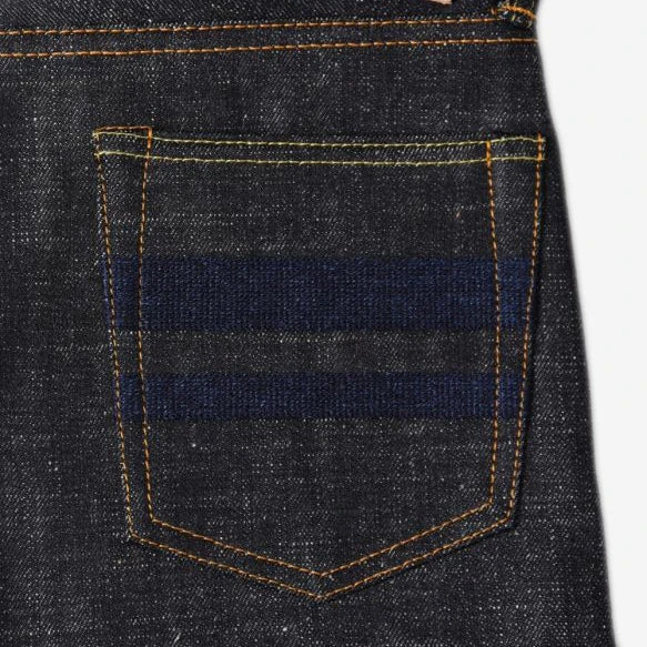 The 0306-82IE from MOMOTARO is sewn using a sanforized denim that features an uncharacteristically high amount of slub texture, made possible through a low-tension weave style coupled with US Cotton. The denim sports a classic indigo colour that will fade to a vintage blue with wear. For the iconic “Going to Battle” (GTB) stripes, MOMOTARO has used vintage embroidery machines. This raised texture will become enhanced with time and fade beautifully. This embroidered detail is made with grand indigo dyed threads. Other classic details include pink selvedge and inseam, both of which serve as an homage to the peach in the original “Momotaro” folktale. The “Going to Battle” stripes are a symbol of Japanese tradition representing honor and strength. The warrior stripes also represent the flag carried by “Momotaro” in the folklore story.