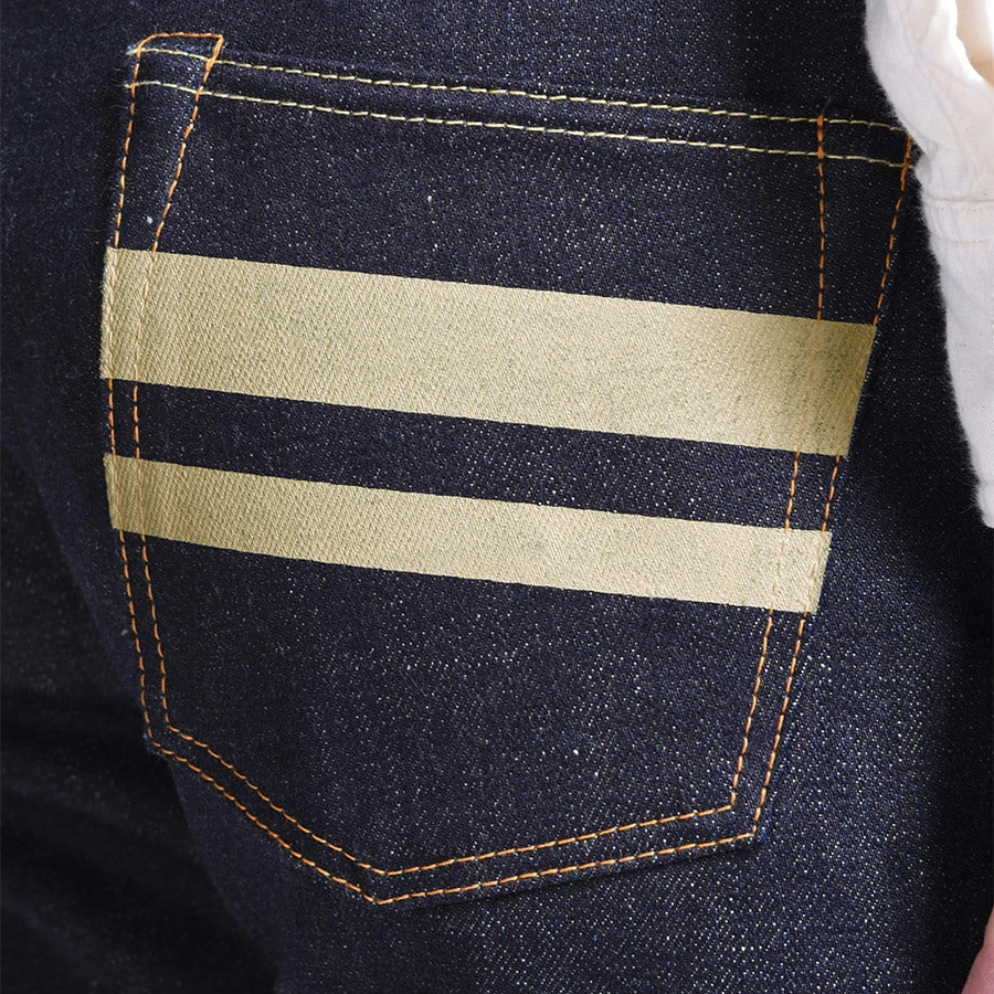 The 0605-BESP from MOMOTARO is made using the brand’s 18oz Zimbabwe cotton selvedge denim – sanforized (washed once) for immediate wear. This special installment features a rich beige coloured weft designed to yield a rustic “dirty fade” with continued wear. The fabric is stiff and rigid and widely praised for its fading colour and character. The denim is made entirely from Zimbabwe cotton and has a smooth yet hairy surface. Loaded with signature MOMOTARO details, including the iconic battle stripes, but in beige! as well as pink selvedge and inseam, both of which serve as an homage to the peach in the original “Momotaro” folktale. The “Going to Battle” stripes are a symbol of Japanese tradition representing honor and strength. The warrior stripes also represent the flag carried by “Momotaro” in the folklore story.