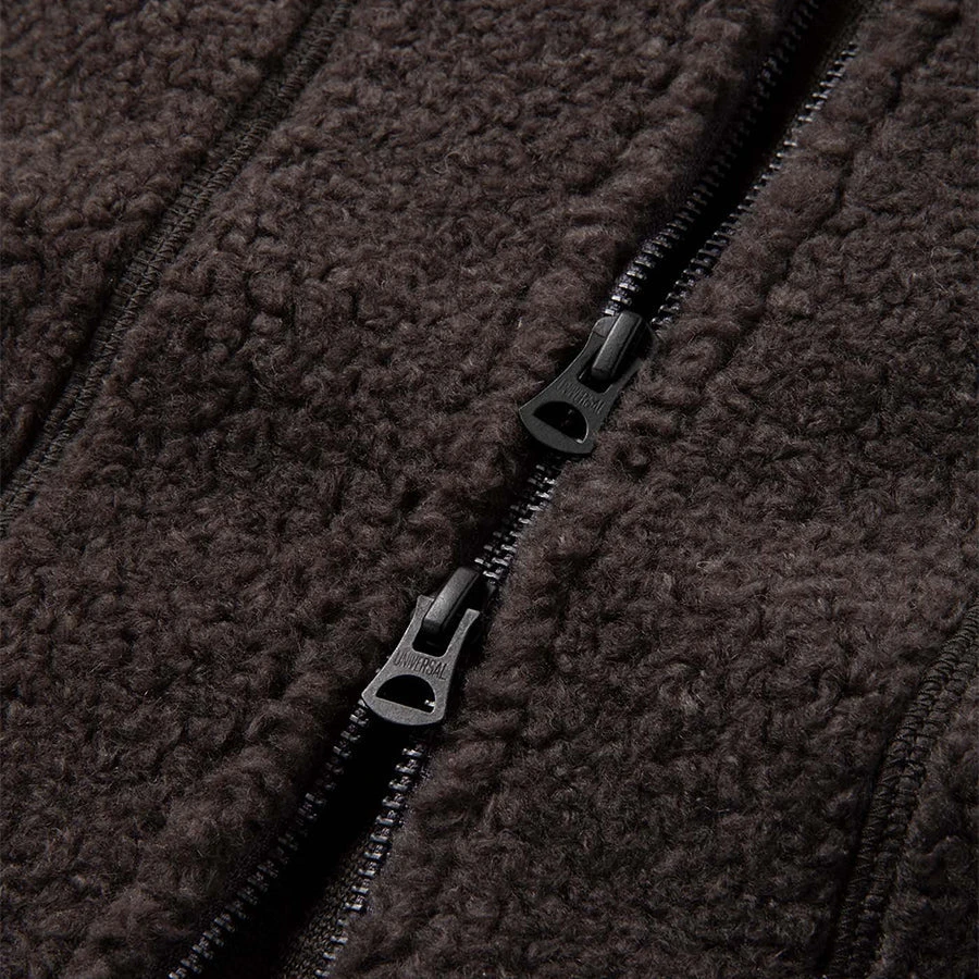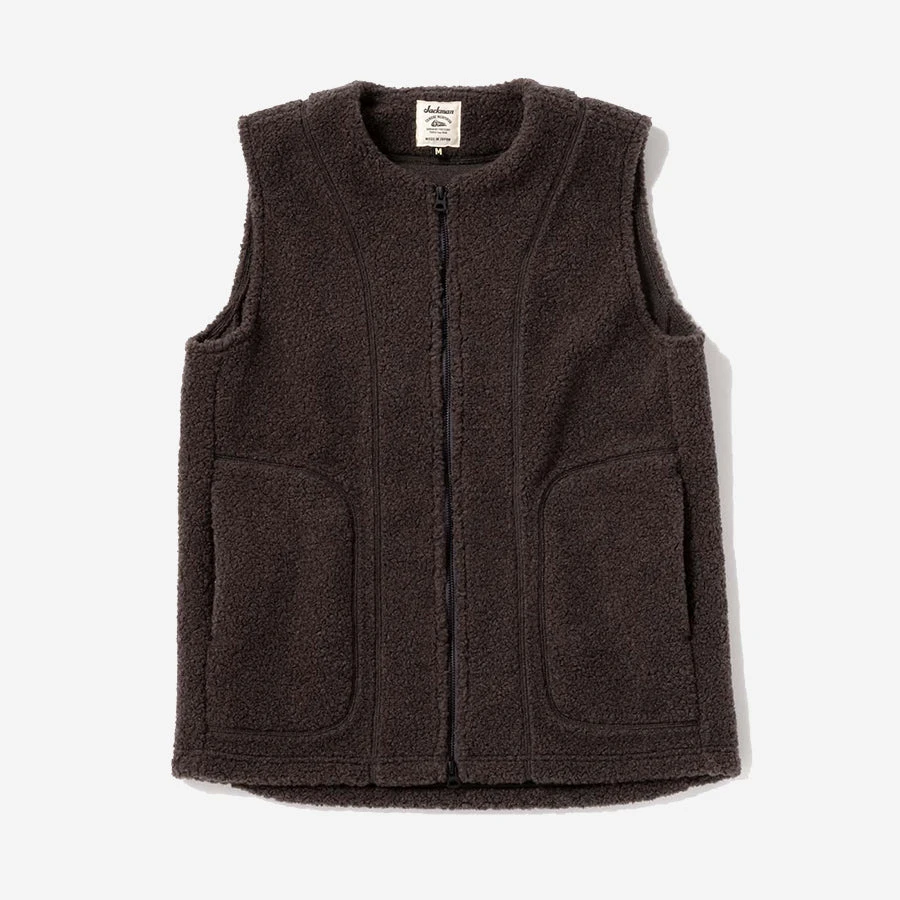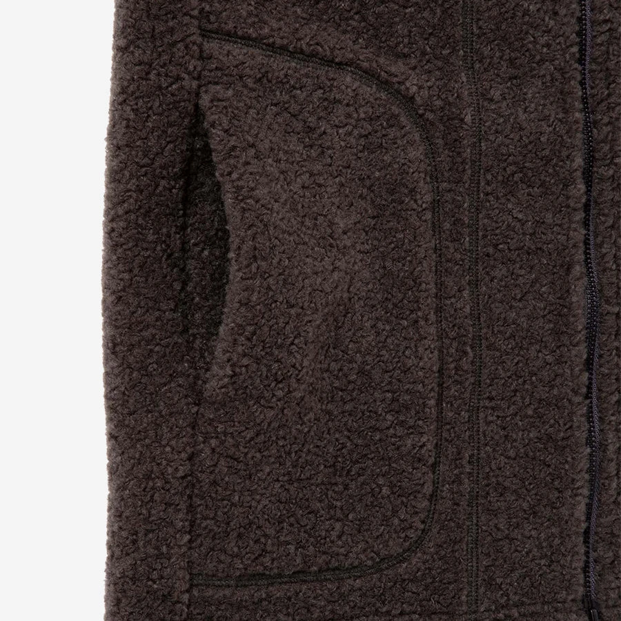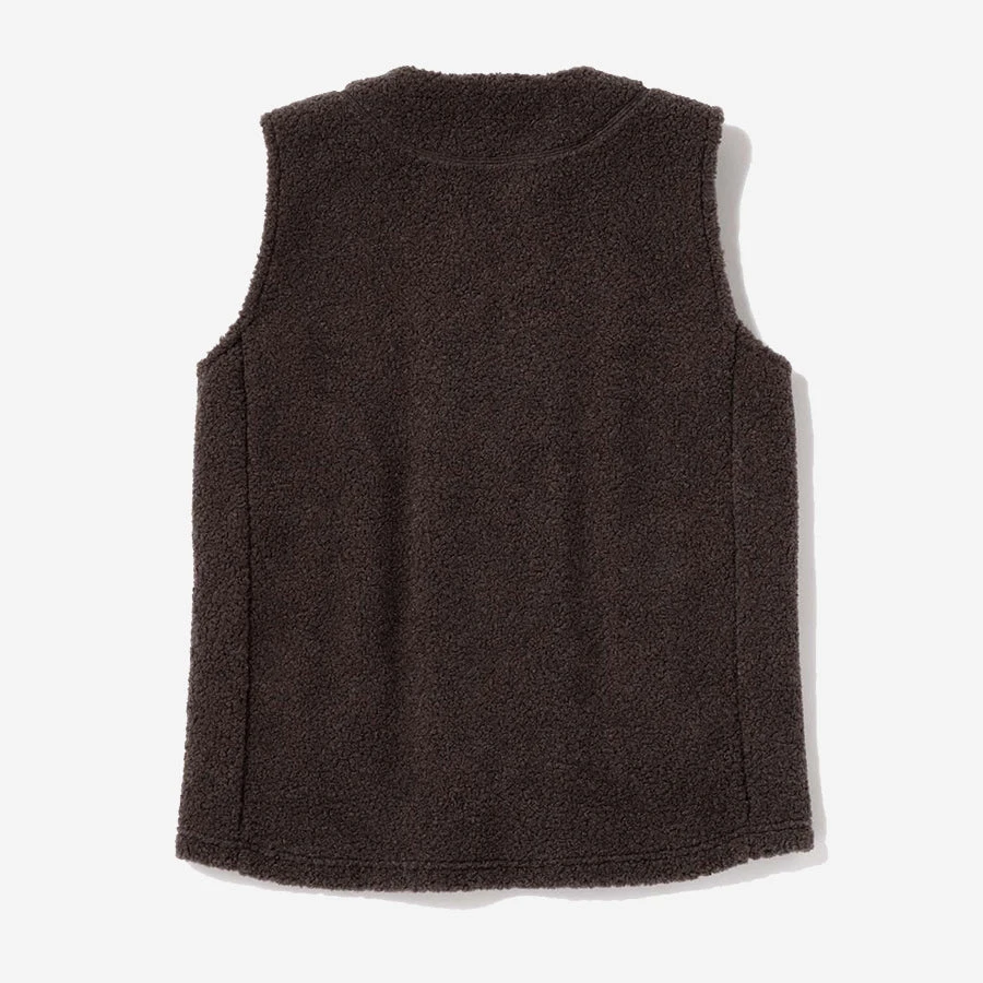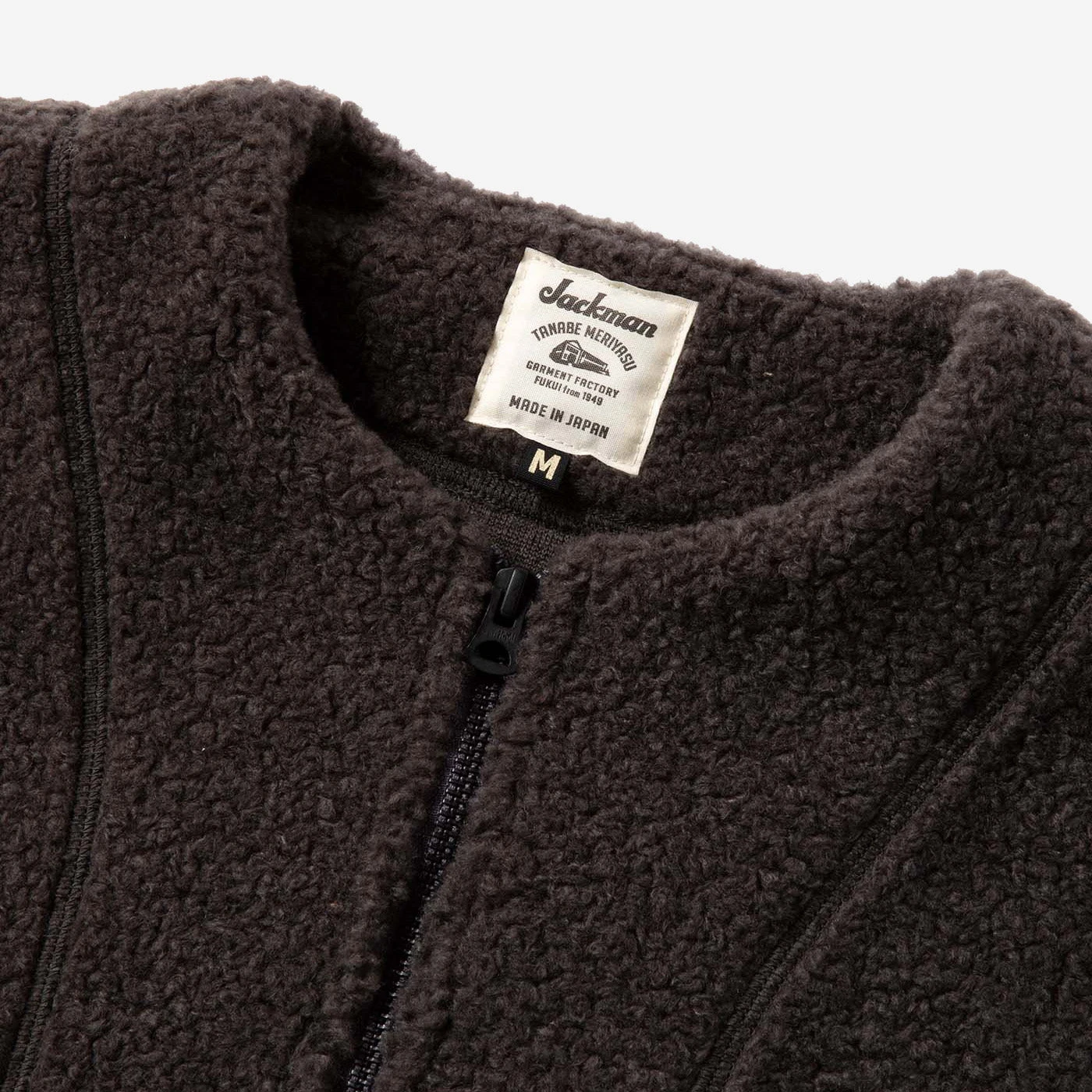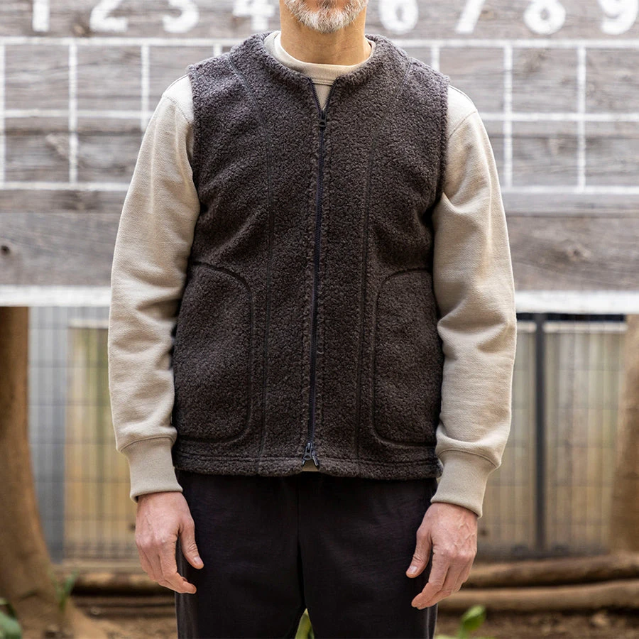 This vest features a crimp boa that curls the hair to prevent it from falling out and retains warmth by trapping air. It has strong wind-breaking characteristics too, achieved by the dense knitting of the wool blend yarn. It is an item that can be worn as a middle layer with excellent heat retention and light weight. The materials and design ideas are based on the vests worn by American baseball players during off-season. In order to make the back look beautiful when worn, the back length is slightly elongated. Finished with a double-zip and side-seam pockets.