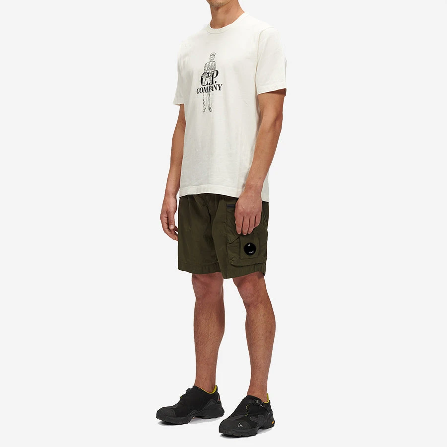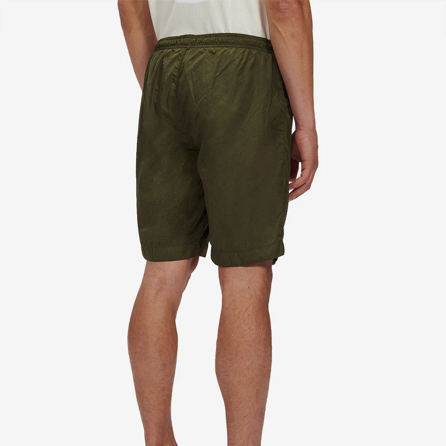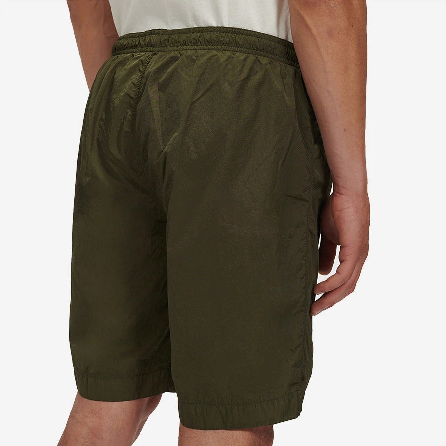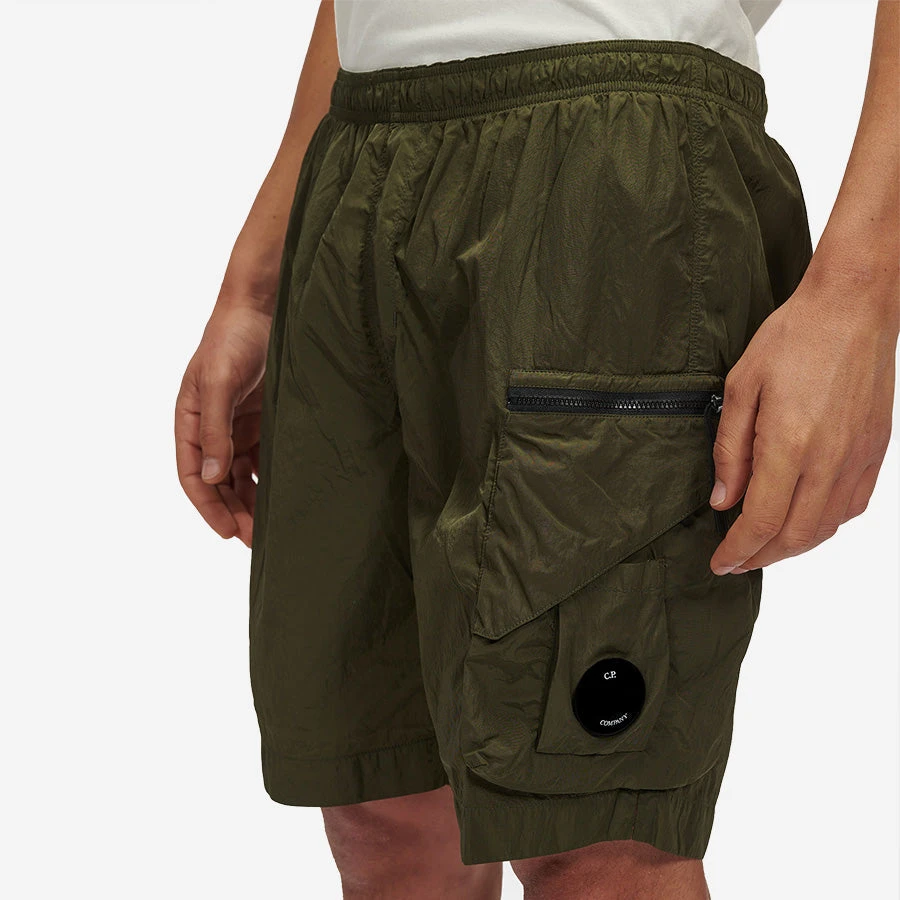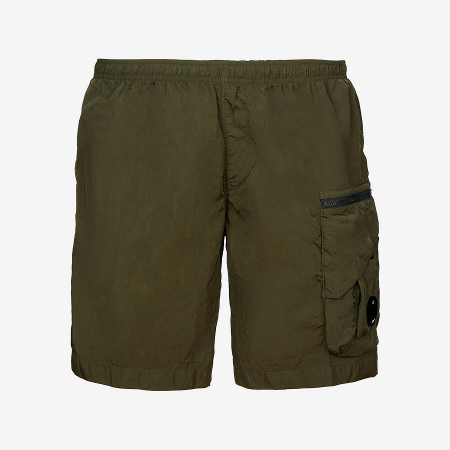 Nylon dyed utility shorts constructed with an elasticated drawstring waist and secure leg compartments with a Lens detail. Chrome is C.P. Company’s foundation woven multifilament nylon. This new version uses Econyl® regenerated nylon yarns, created through the upcycling of fishing nets.