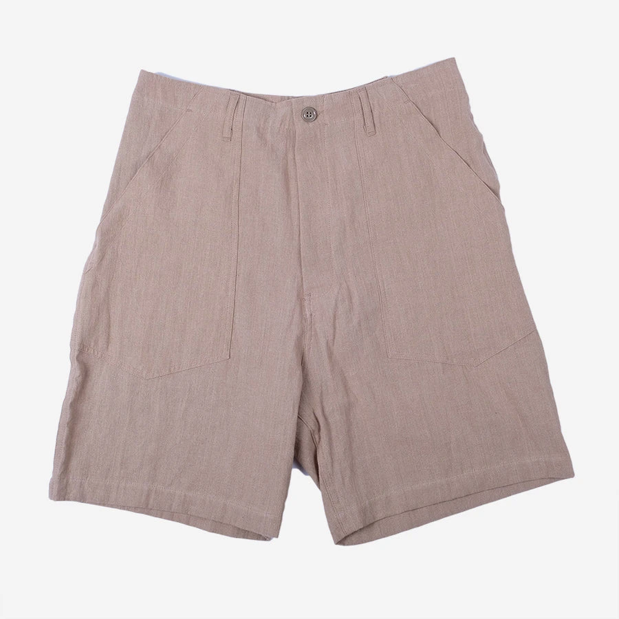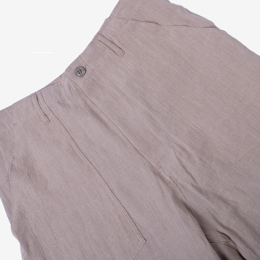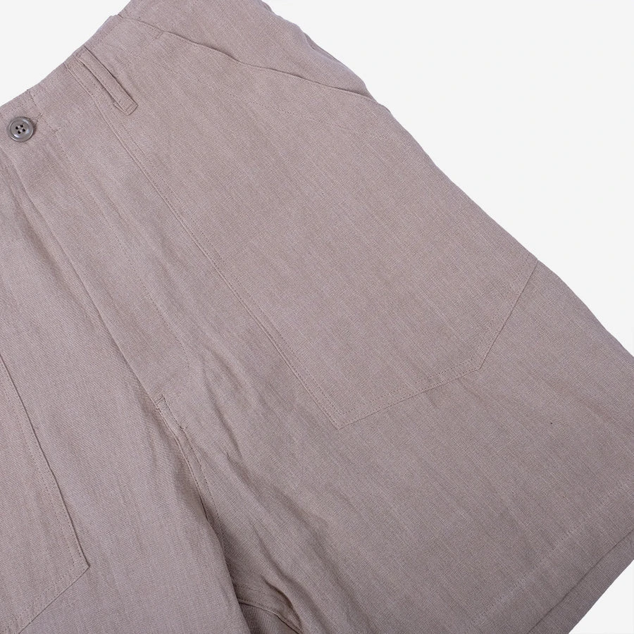 This linen blend fabric was developed with an inspiration from the WWII US Military Tropical Combat Uniform. Washed with enzyme for extra softness, this Linen/Cotton blend fabric features super nice touch. The more your wear the better the fabric will be. The fabric naturally memorizes wrinkles and creases to form to your body. It will grow with you as your life goes on. These fatigue shorts feature two front patch pockets that are nicely attached with double needle stitching. The bottom area of the pocket is finished with a pointed shape for the aesthetic. The openings are reinforced with bar tacks. The two rear patch pockets have the added button flap closure. The extended YKK zipper fly elevates the level of comfort while the closure features military-standard melamine buttons. The clean binding finish around the fly elevates a level of perfection in the interior with a clean finish while the double-needle flat-felled seam construction encases the raw edges to protect them from fraying.