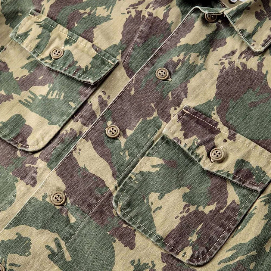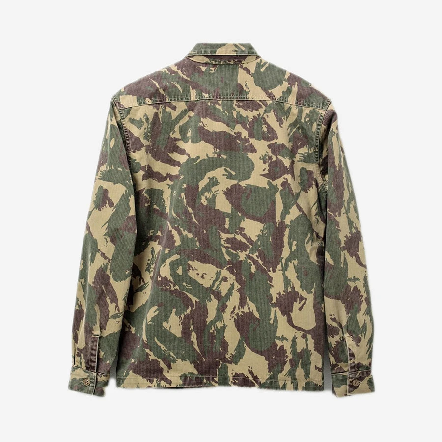 This military-style shirt-jacket is composed of 100% herringbone cotton in a Camouflage print. Adding to the militaristic aesthetic are the flap pockets on both chests, reminiscent of Naval CPO shirts. Completing matters are a regular fit, straight hem and resin button fastened placket. The workwear vibes come courtesy of the D-shaped patch pockets near the waist. The softer fabric makes it perfect for the hotter months and it adds an ideal outer layer to smarten up any outfit.