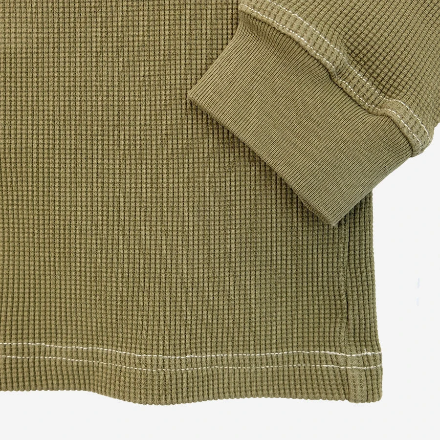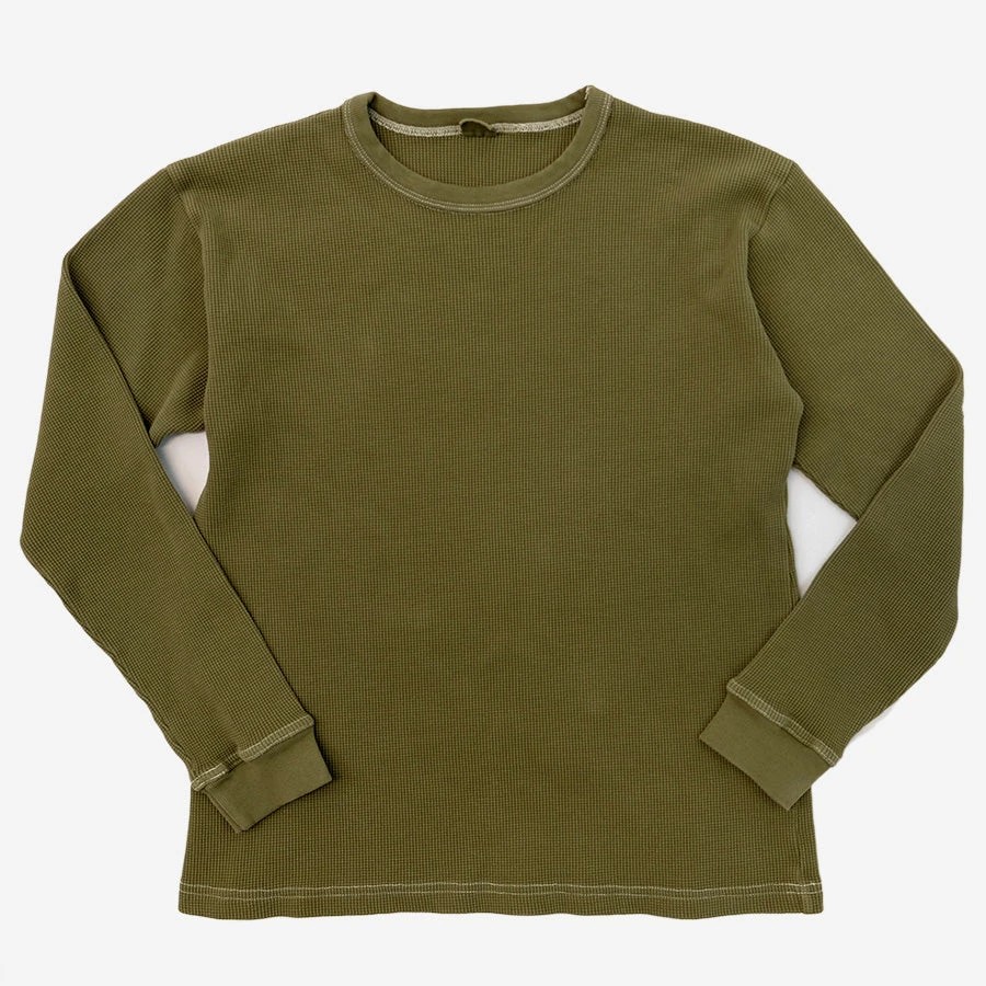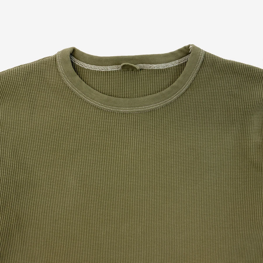 The long sleeve Thermal from 3sixteen features a heavyweight waffle cotton fabric that’s custom knit in Canada. The long sleeve Thremal has a triple needle coverstitched, never-sag collar that stays tight around the neck over extended wears and finished in a garment dyed Olive Green.