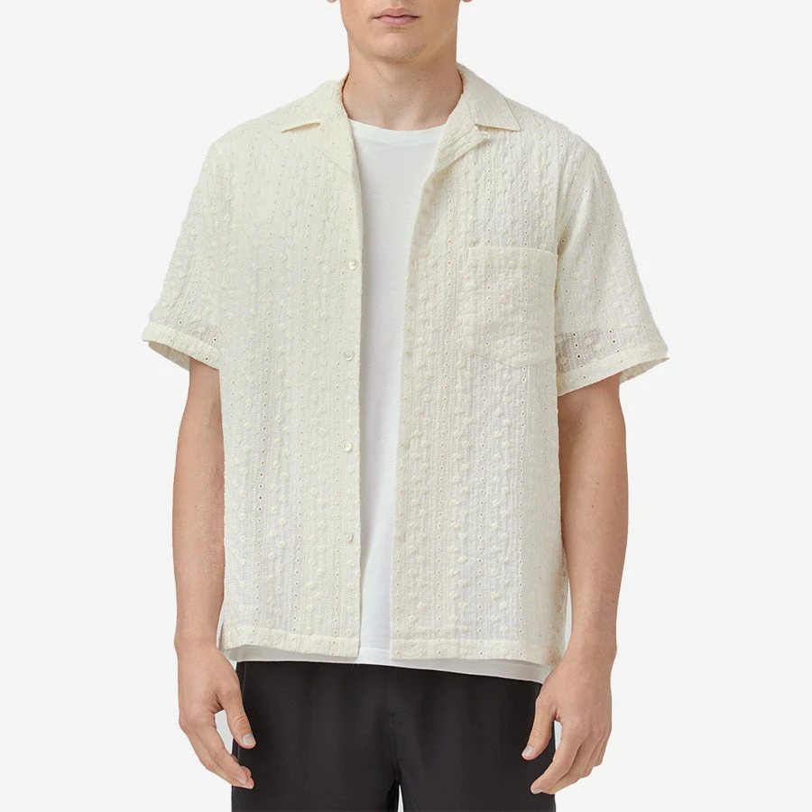 The Piros is a summer-ready shirt in a soft and lightweight Cotton/Poly blend. Embroidered with a floral pattern, this Vacation (or Camp collar) shirt is sure to liven up any wardrobe rotation. Made in Portugal, this style is trimmed with a patch pocket to the chest, open collar and white buttons finish the look.