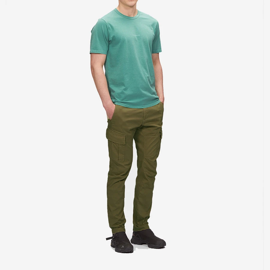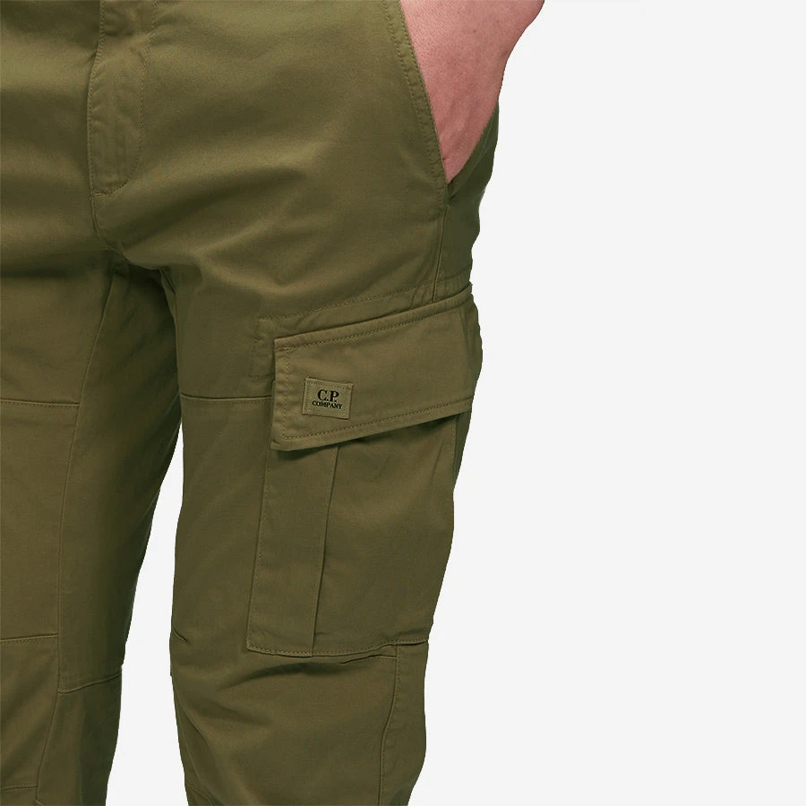 Functional cargo pants crafted in an ergonomical fit featuring belt loops, zip fly and button fastening and slanted hand pockets. Completed with two back pockets and two cargo flap pockets and finished with a C.P. Company logo detail. Engineered in lightweight Stretch Sateen, a matte cotton textile with built-in extensibility, for a flexible and durable fit. Garment dyed for an increased chromatic depth and intensity throughout.