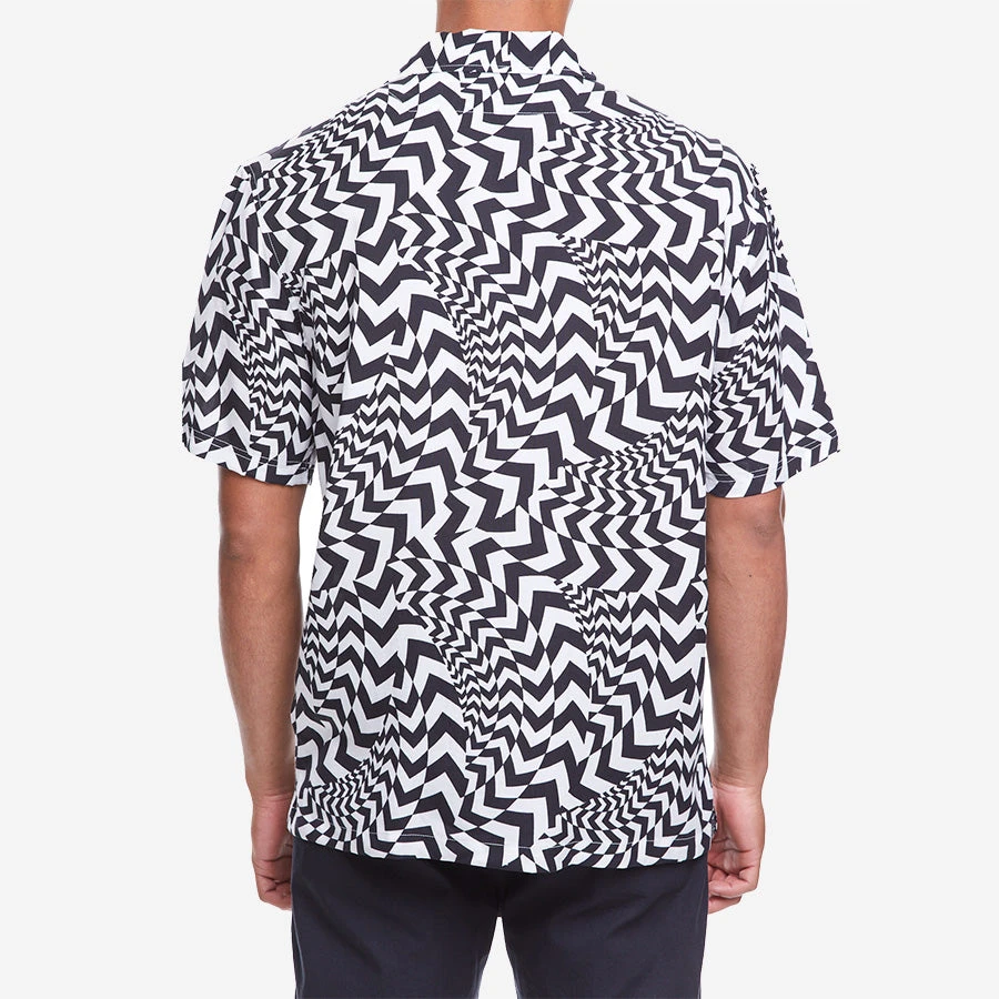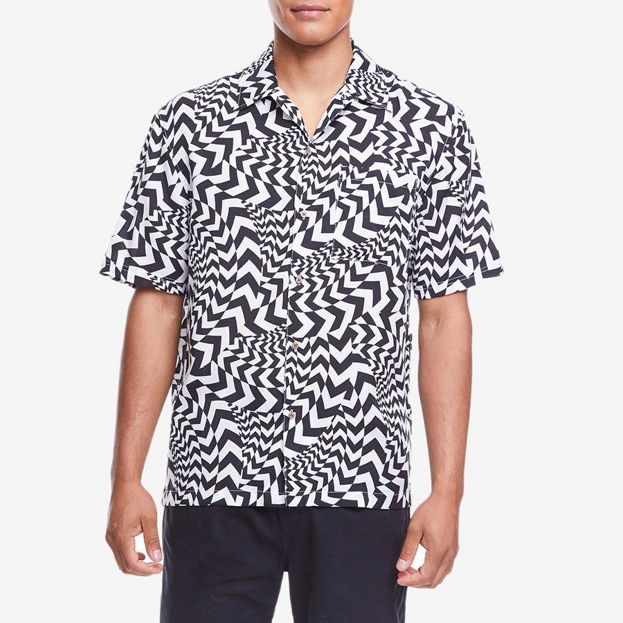 Boardies zigged and they zagged until they could create the perfect print for the new season. This fresh Hazard print combines the black of volcanic sand with the white of the sea foam. Made from 100% Tencel and details include a coconut-button placket and front pocket. With a relaxed silhouette and breezy fit, this shirt is perfect for warm-weather wear.