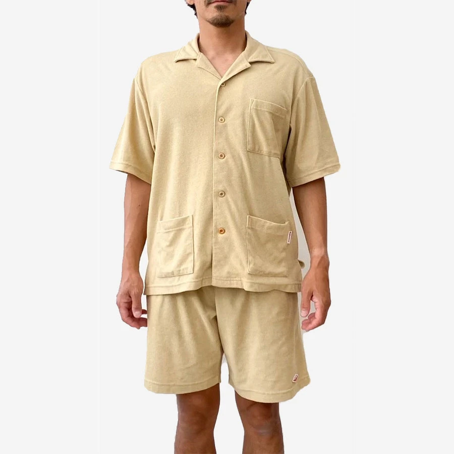 Battenwear wanted to make an outfit to throw on after a swim and then hang out in for the rest of the day. So they made the Lounge Shirt and Shorts to accompany the Beach Tee. Cut from a Cotton/Poly Terry Cloth, these roomy shorts feature an elastic waist and spacious pockets on the front and back. Finished with a woven label on the left leg. Basically, they’re a great pair of shorts to take on a vacation and to count on being ready for anything.